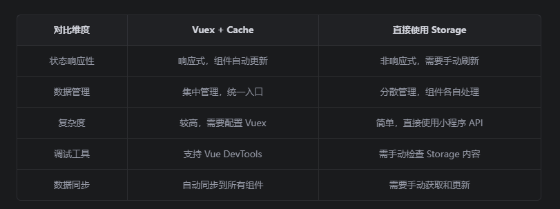 我需要分析两种登录状态管理方式的不同和优缺点:当前项目使用的Vuex + Cache方式 vs 直接使用微信小程序storage的方式。# Vuex + Cache 与 直接使用微信小程序 Storage 的对比